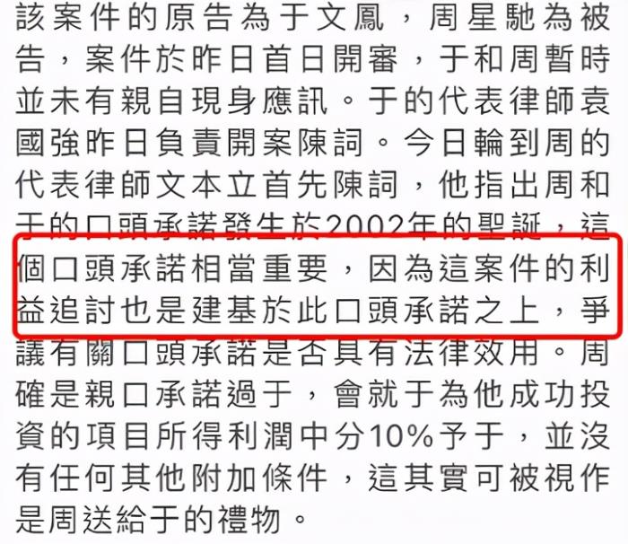 于文凤的律师认为周星驰亲口承诺过,会把自己投资项目所得利润的10%给于文凤,算是给于文凤礼物。
