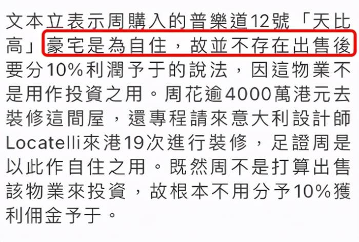 但是周星驰的代表律师却表示周星驰曾经花了4000万港币(约3300万人民币)进行装修,认为卖出去的豪宅属于自己住的,根本不算是投资,所以就不存在投资利润这一个说法,更不用说佣金了。