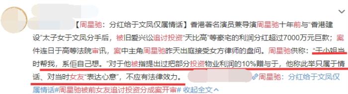 周星驰被前女友追讨投资分成,而被前女友于文凤告上法庭,他抗辩说 "于小姐当时帮我,是她自己想。"对于他被指提出过把部分投资物业利润的10%赠与于文凤,他称此举只属于情话,对当时女友"表达心意",不应有法律效力。"