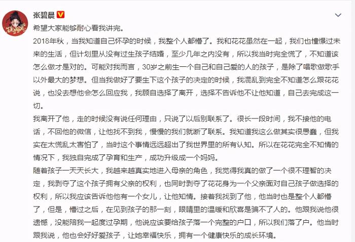 随后,张碧晨发布长文,称自己是在花花不知情的情况下,单独完成了十月怀胎和分娩,想必也非常艰辛吧。