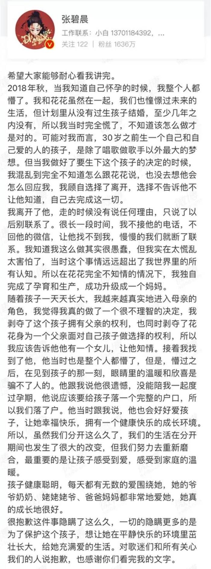 就在大家疑惑他跟谁有一个孩子时,紧跟着孩子的妈妈张碧晨发布了一篇长文,解释了她生女的过程。