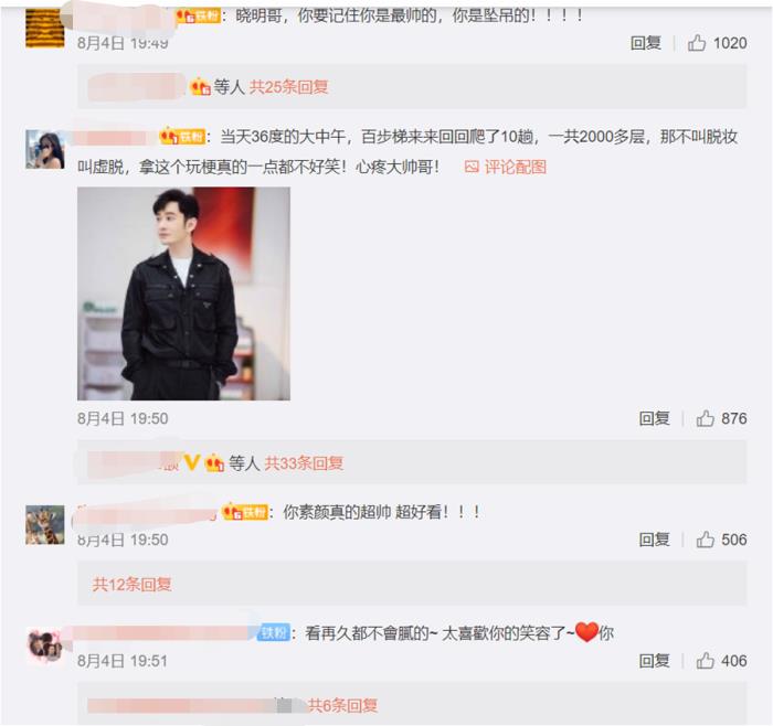 再回到当晚节目中黄晓明中暑脱相的画面引发了某些网友对他真人素颜不在线的疑虑,这种声音经过网络的发酵也形成了不小的声势,毕竟,国民艺人的属性决定了颜值管理也是其职业素养的一个重要表现。