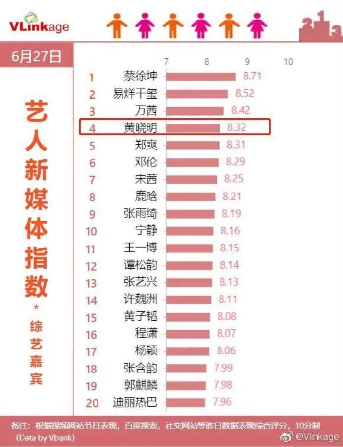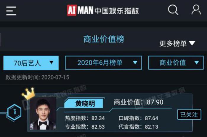 还是作为娱乐行业最权威的艾漫数据发布的2020年6月的商业价值榜单来看,黄晓明始终能够名列前茅。
