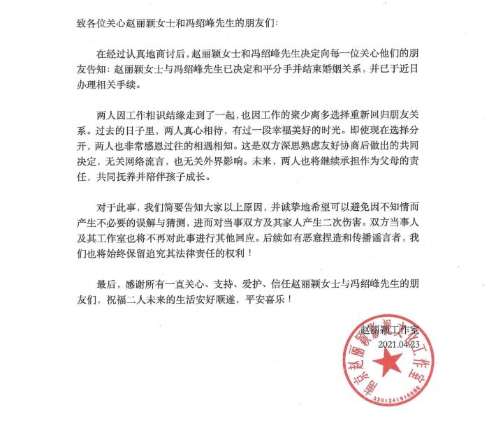 2021年4月23日,冯绍峰与赵丽颖宣布离婚。