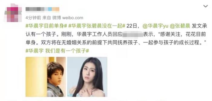 1月22日,在被曝和张碧晨恋爱后,华晨宇在社交平台上公开承认表示自己确实和张碧晨有一个孩子,震惊一众网友,迅速登上热搜榜。