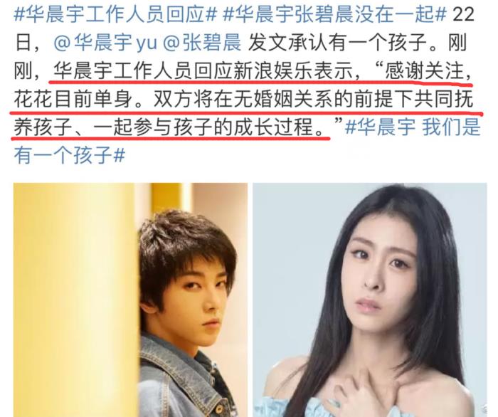但他俩虽然有了孩子,却没有结婚,张碧晨是未婚生子,华晨宇工作人员也回应说他目前单身,双方将在无婚姻关系的前提下共同抚养孩子,一起参与孩子的成长过程。