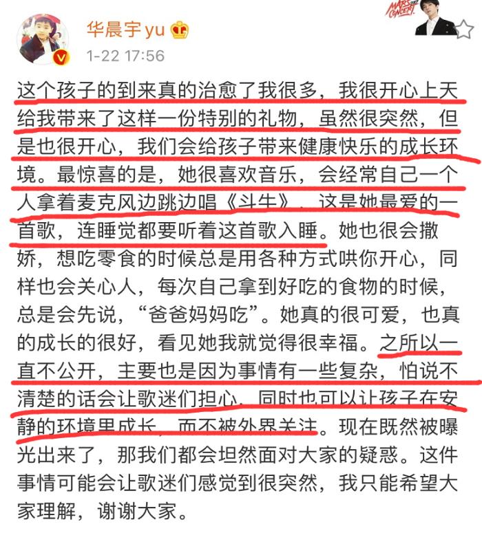 之后华晨宇也发了条长文,称这个孩子的到来治愈了他很多,虽然事发突然,但他也很开心,还表示孩子也非常喜欢音乐,他们之所以一直不公开也是因为事情过于复杂,怕说不清楚引起粉丝担心,也希望孩子能在一个安静的环境下成长。