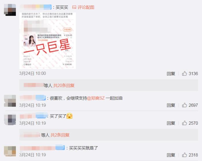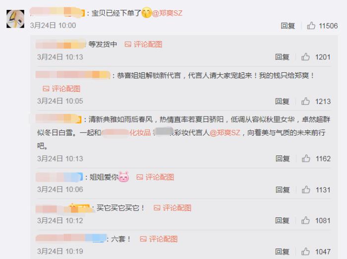 化妆这可是每个女孩子都经常会做的事,买一些化妆品也是很有必要的,很多女生都化妆品都是没有抵抗力的,何况这次还是由自己的爱豆来代言,这下即使是掏空核荷包也要买买买了。这次在评论区中就可以看到很多的粉丝都在跟郑爽说自己已经下单了,而且还说要支持姐姐!