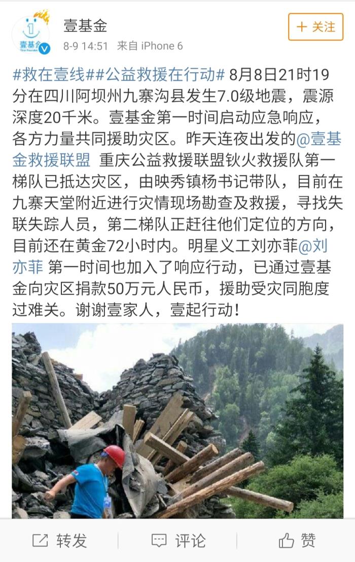 17年九寨沟地震,刘亦菲捐款50万元。