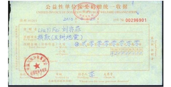 10年玉树地震,刘亦菲捐出20万,有理有据有发票。