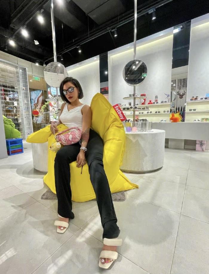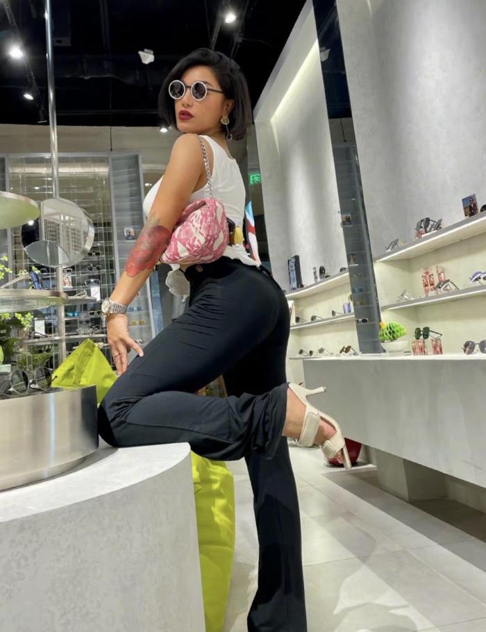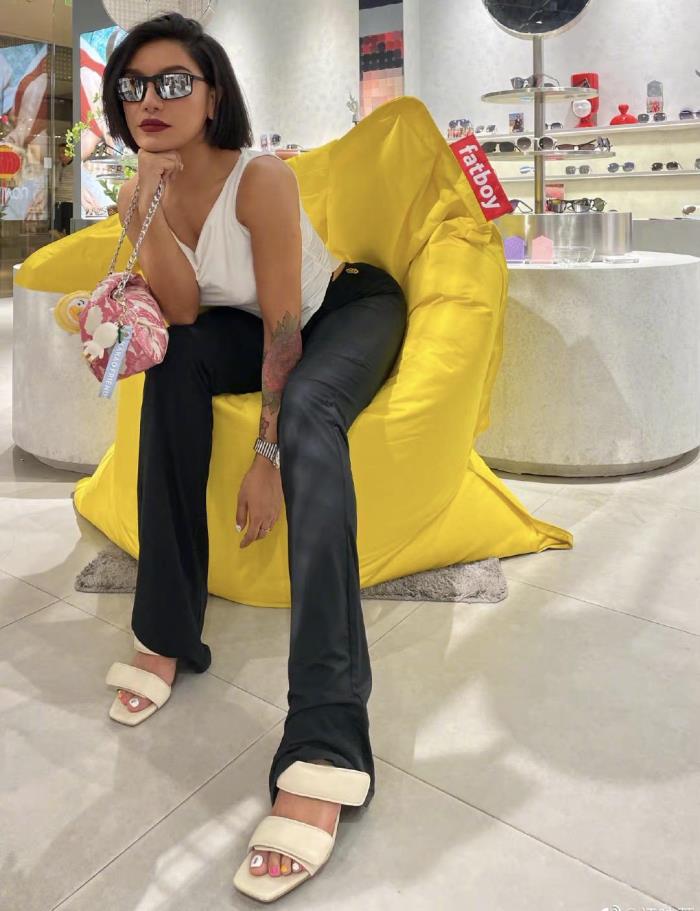 白色的指甲油,让双脚显得更加时尚靓丽,粉色的小包则展露出一份少女心。胳膊上的纹身更加显出一种个性和酷帅。