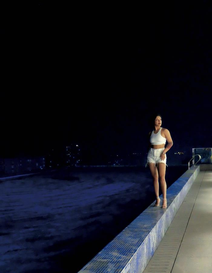白色的背心看起来十分热辣的感觉,搭配紧身的黑色长裤,愈发展现出一种S型的婀娜曲线,白色的高跟鞋更映衬出一种妩媚的感觉。