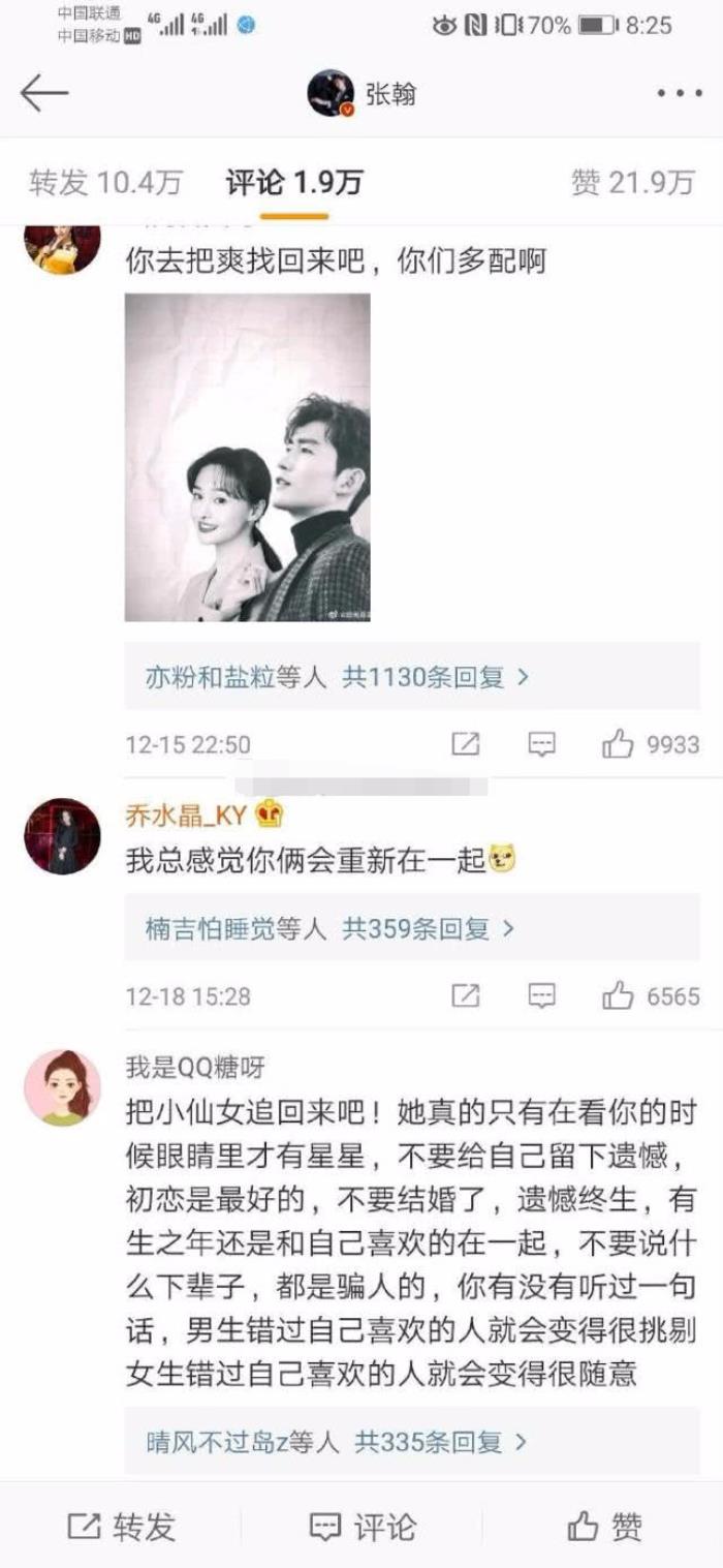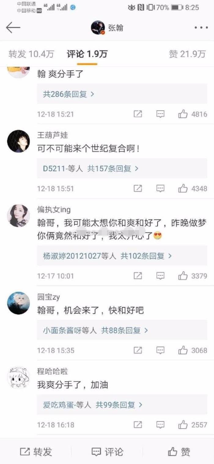 而在与张恒被曝分手后,更是有不少的粉丝来到了张翰的微博下纷纷留言表示:“翰哥,机会来了,快和好吧”,“我爽分手了,加油。”