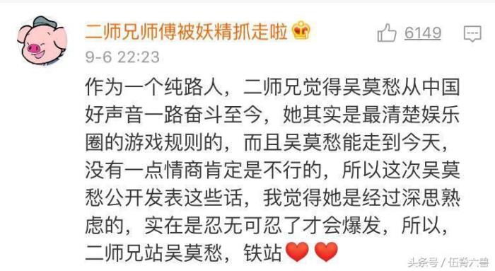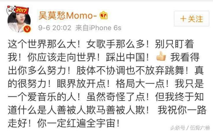 “为什么世界上会有这种在背后搞小动作的人!善良点不行吗?”虽然没有指明,但是也可以看出来吴莫愁的情绪十分激昂,对这位女歌手也是深恶痛绝!
