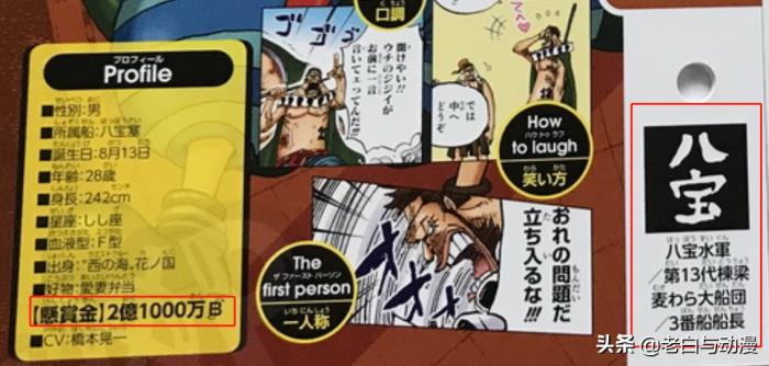 再来说下老蔡的赏金,在之前大家只知道青椒的赏金,超过了五亿,而对于老蔡的赏金却一无所知,这次生命卡终于公布了老蔡赏金,为2亿1000万贝里,而且老蔡的年龄竟然才28岁,这还真看不出来!另外至于老蔡为什么会被悬赏?因为在花之国老蔡统帅的八宝水军是海贼,不过他们是被花之国认可的海贼,同时还是花之国的护卫,这也就是为什么老蔡能来玛丽乔亚的缘故,因为官方认可!