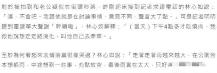 但面对外界的各种纷扰,林心如在电话中回复媒体表示当天两人在探讨事情,意见不一样,说话声音有点高,但不是在吵架,而两人分开走是因为她当天吃得很撑,想要走走消化一下,霍建华则一个人开车回家。