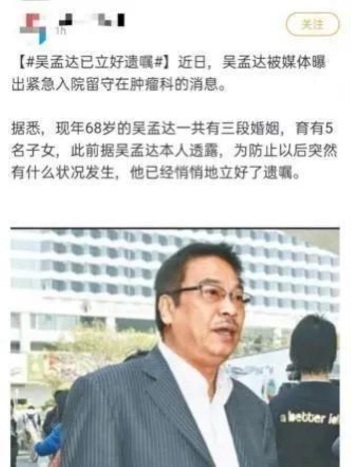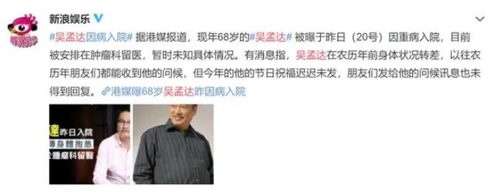 据香港媒体报道,2月20日,香港演员吴孟达重病入院,秘密入住肿瘤科治疗。