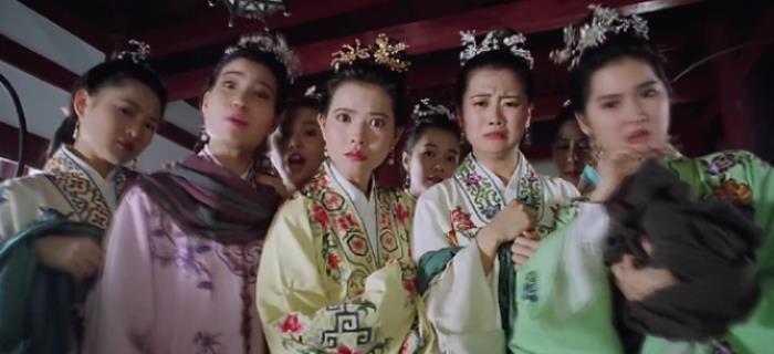 当时,蓝洁瑛扮演唐伯虎的八位夫人之一,图中穿黄色衣服的便是蓝洁瑛了。她在片中只是客串,大大的眼睛,应该是八位夫人中最美貌的一个。