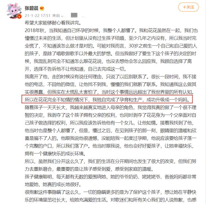紧接着是张碧晨的千字小作文,她在文章里讲述了自己跟华晨宇情投意合、意外怀孕、怀孕之后带球跑等一系列故事,狗血程度丝毫不亚于言情小说。