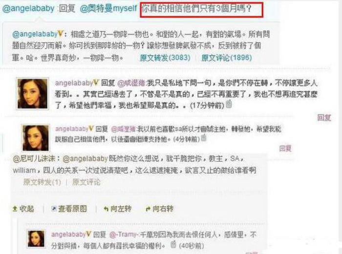 阿sa离婚后,交往的第一个新男友又是baby的前男友陈伟霆,而baby更曾在社交平台公开质疑两人相恋时间,内涵过阿sa插足自己与陈伟霆的恋情。