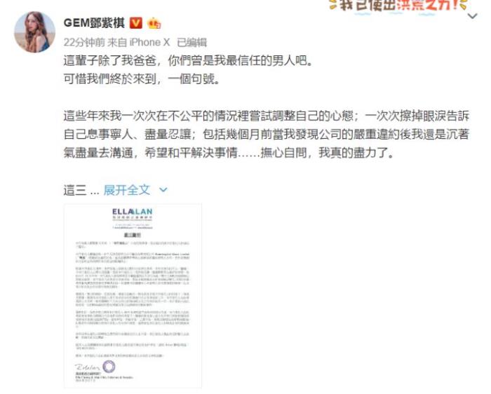 3月7日,邓紫棋在微博发布了一篇长文宣布解约,并附上她委任的律师行的一封声明。