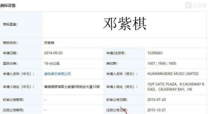 毫无疑问,邓紫棋是这家公司挖到过的最大一块“宝藏”。而早在2014年9月,蜂鸟音乐就已经将“邓紫棋”和“G.E.M”申请商标注册,领域涵盖文娱、珠宝、广告销售等。