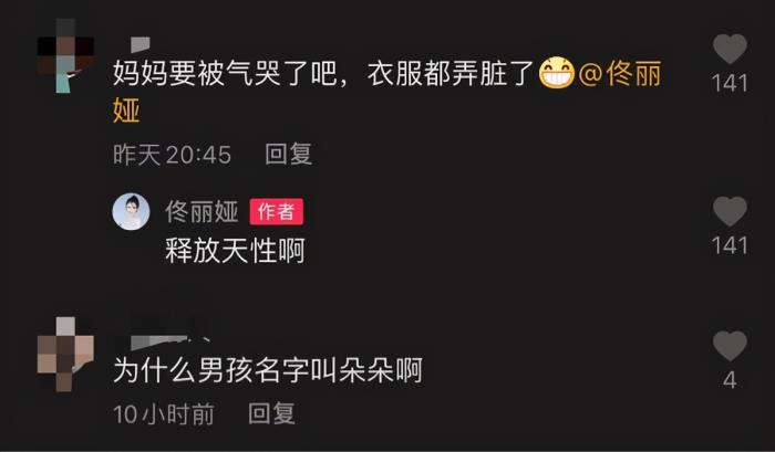 评论区里,有网友调侃佟丽娅要气哭了吧,衣服都弄脏了,但佟丽娅则回应:“释放天性啊”。还有很多人不解为什么男孩子要叫“朵朵”。