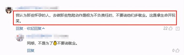 所以对于这种行为,有网友怒批道:“那些怀孕的人,去做那些危险动作是极为不负责任的,这是拿生命开玩笑,更不是敬业。”