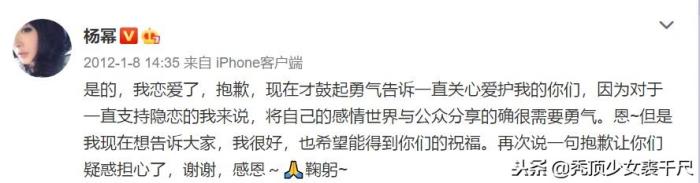 杨幂刘恺威两人因拍摄《如意》擦出火花,2012年1月,两人公布恋情。