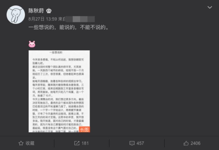或许是由于陈秋莳只是一个乐手,而非张靓颖这样的大明星,他的社交账号只有6900个粉丝。该长文虽在前一天下午就发出了,但一直到28日才逐渐发酵,引起大家的注意。