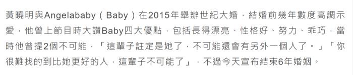 黄晓明上节目也是时时刻刻把baby挂嘴边,称赞女方四大优点,夸baby长得漂亮、性格又好、努力、乖巧,甚至还承诺“这辈子(伴侣)注定是她了,不可能还会有另外一个人了”,表示这辈子不可能找到比她更好的人,没想到当初话说得斩钉截铁,现在却平淡宣布离婚,真是世事变迁。