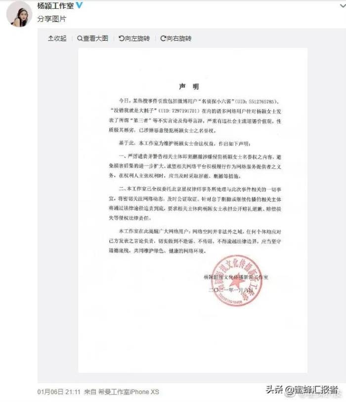 随后杨颖工作室发声明表示对于恶意造谣者将采取法律手段维权处理。