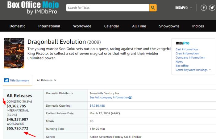 根据Box Office Mojo上显示的信息,这部《七龙珠:全新进化》耗费了4500万美金的制作成本。2009年时,美金与人民币的平均汇率保持在6.81左右,这个制作成本折合成人民币有3亿之多。