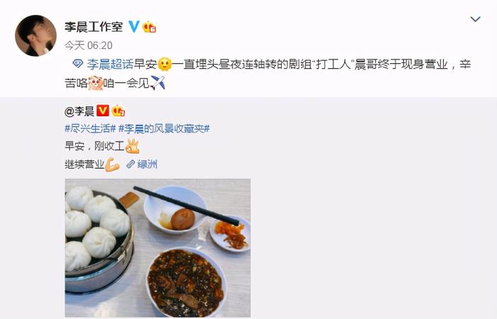 4月11日一大早,凌晨在个人的社交平台上晒出了一张美食照片,并为此配文:“早安,刚收工,继续营业”,还带上了“尽兴生活”、“李晨的风景收藏夹”的话题,一时间也受到了网友们的广泛关注,随后李晨工作室也转发:一直埋头昼夜连轴转的剧组“打工人”晨哥终于现身营业,辛苦咯,咱一会见。
