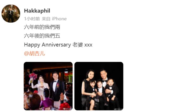 李乘德也在网上发文庆祝纪念日,他晒出自己和胡杏儿六年前和六年后的对比照,直呼对方为“老婆”,高调秀恩爱。