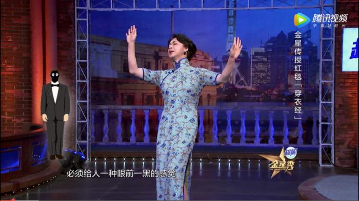 首先金星谈到“走红毯”的穿着,在谈到男明星的时候,金星说男明星一般要穿黑西装,黑皮鞋,总之“必须给人一种眼前一黑的感觉”,然后还不忘打趣一下沈南。