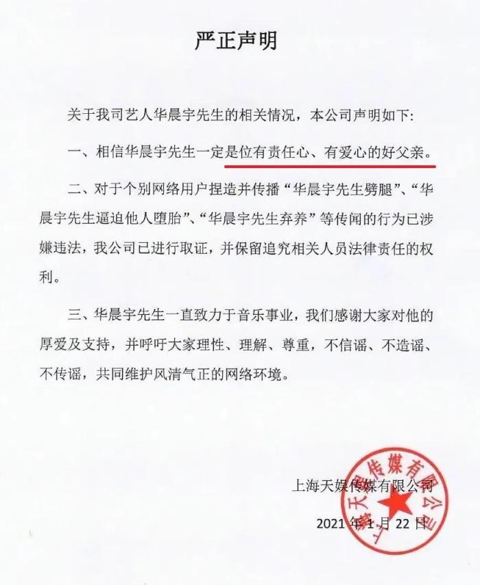 不过,对于这种传言,华晨宇工作室很快就发声明辟谣了,强调他是有爱心 、有责任心的好父亲,其他都是谣言。