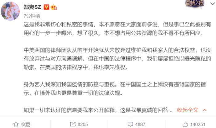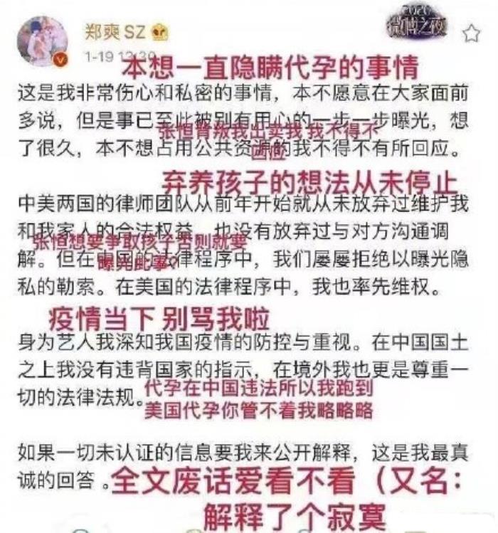 1月19日中午,郑爽沉默了一天一夜之后,终于对代孕风波做出了回应。郑爽回应的篇幅不算长也不算短,条理倒也还挺清晰,她表示这是她非常伤心和私密的事情,本不愿意在大家面前多说,但现在因为被别有用心的人一步一步曝光,因此不得不有所回应。