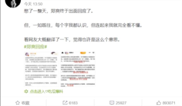 网友的翻译可以说非常形象,很符合郑爽以往的说话风格,也就是她本人独有的“爽言爽语”。其实郑爽回应的潜台词跟网友翻译的也差不多,只不过网友是运用了夸张手法。