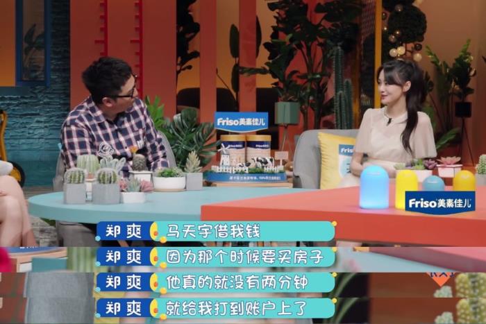 郑爽说自己曾经想要在上海买房,打算在那里定居下去,但是因为自己的经济比较紧张,所以就向马天宇开口借钱,结果刚说了不到两分钟,马天宇就把钱打到了她的账户上。这种非常信任又爽快的方式,让郑爽感觉到自己被宠爱,而马天宇对此的回答说,他是非常信任郑爽的,在他眼里是交往多年的好友,所以有困难也是毫不犹豫的帮助。
