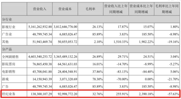 事实上,虽然欢瑞的艺人经纪占比不到10%,但2017年欢瑞艺人经纪板块增长较大,营收金额和占总营收比重都有增加,同比增长240.86%。