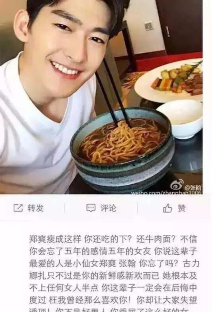 但话说回来,虽然CP的粉丝们有很多话要说,对于张翰来说,郑爽本人不仅是一个在他心中难以提及的记忆,包括郑爽粉丝给他带来的影响。还记得两人宣布分手后,郑爽的粉丝曾经指责张翰是导致他们分手的导火索。郑爽的粉丝们也很不讲理,有一次,张翰在微博上发布了一张吃牛肉面的照片。结果,郑爽的粉丝说:“小爽这么瘦,你还在吃牛肉面吗?”直到现在,它仍然受到许多网友的嘲笑。