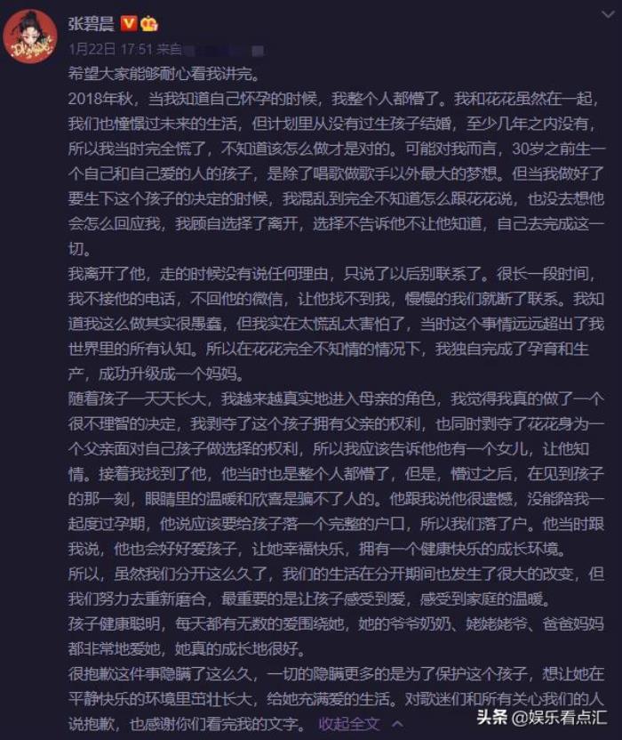 在1月22日17:51分,张碧晨发布了一条微博,主要讲述与华晨宇感情,以及远走他乡生下女儿,还有为了女儿重新回到华晨宇身边。