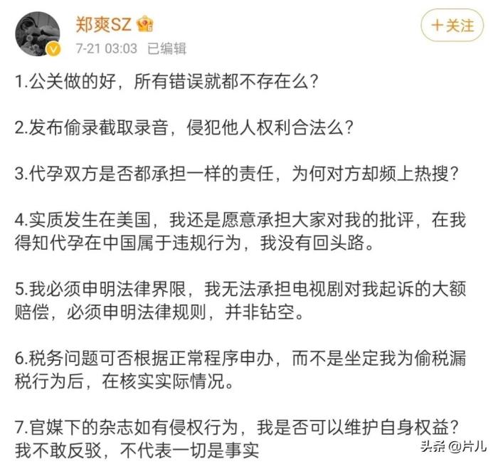 郑爽在文中第一条除了强调自己没有公关外,更是在第二条中质疑张恒偷偷录音侵犯了她的权益。同时,郑爽还在第三条中反问张恒,代孕是否他也有责任。值得注意的是,郑爽在第四条中声称代孕发生在美国,所以她得知在中国不被允许后,已经没有回头路可走,所以只她愿意接受批评。