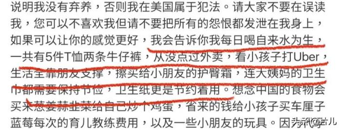 郑爽写道“每日喝自来水为生,一共有5件T恤两条牛仔裤,从没点过外卖,看小孩子打Uber,生活全靠朋友支撑,擦买给小朋友的护臀霜,连大姨妈的卫生巾都需要保持节俭,卫生纸更是节约着用”。