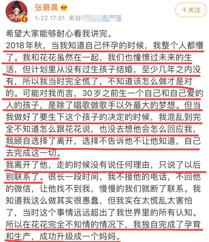 随后张碧晨也发了条长文回应,说孩子是在18年秋天怀上的,当时她完全慌了,不知道应该怎么办,她跟华晨宇当时虽然在一起,但他们计划里还没有要结婚生子,她想把孩子生下来,又不知道应该怎么跟华晨宇说,所以她选择了离开,也没有告诉他自己怀孕了这件事。