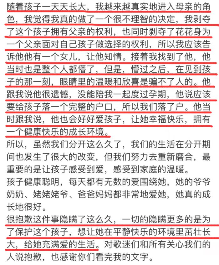 之后华晨宇也发了条长文,称这个孩子的到来治愈了他很多,虽然事发突然,但他也很开心,还表示孩子也非常喜欢音乐,他们之所以一直不公开也是因为事情过于复杂,怕说不清楚引起粉丝担心,也希望孩子能在一个安静的环境下成长。