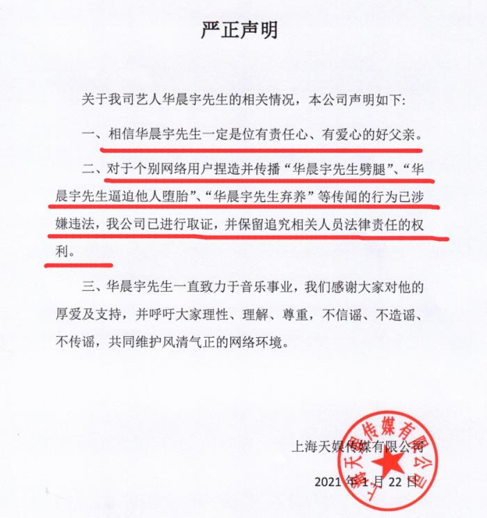 华晨宇工作室刚刚也发布声明,否认华晨宇曾逼张碧晨堕胎,还有弃养、劈腿等相关传闻,还表示他们已经取证,将保留追究相关人员法律责任的权利。