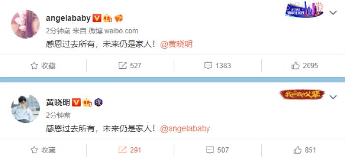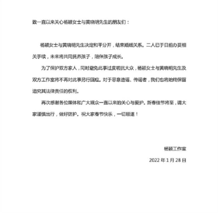 1月28日黄晓明杨颖同时发文官宣离婚,两人使用同样的文案祝福了对方,并且强调双方未来仍是家人。