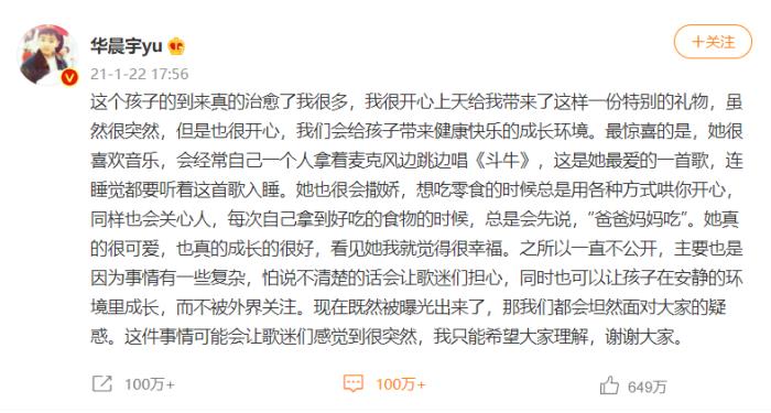华晨宇一句“是的,我们是有一个孩子”,官宣了生女的事。